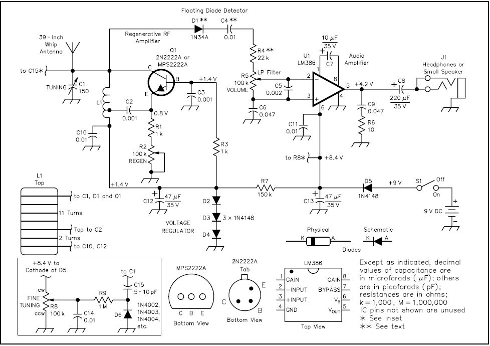 This particular receiver design comes from Charles Kitchin N1TEV.  His design is a modification of a classic design that dates back to the 1920’s.  The main modification is the use of the LM386 audio amplifier IC to give it a little better volume control, the use of 2N2222A transistors (instead of tubes), and the diodes that go to ground to improve regeneration.