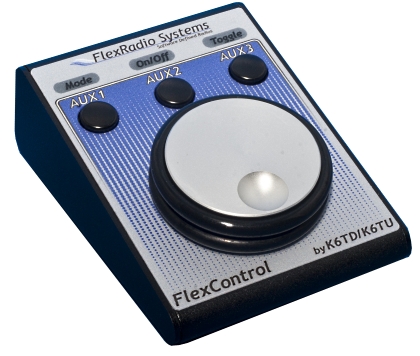 I also got the “FlexControl” with my Flex 5000A. This is a USB connected external tuning knob that works perfectly with the Flex. You plug this knob into the USB port on your PC, not on a port on the Flex. There are 4 buttons that are mapped for specific functions (3 hardware buttons and the 4th button is on the encoder shaft of the tuning knob). The tuning knob is really nice and has a great feel to it. The flex control also works exclusively with PowerSDR even when you have other applications open on your computer and the window focus is not on PowerSDR. This means that you can log, yet still tune your radio without clicking from application to application. This is a must have for a Flex owner that is into contesting.