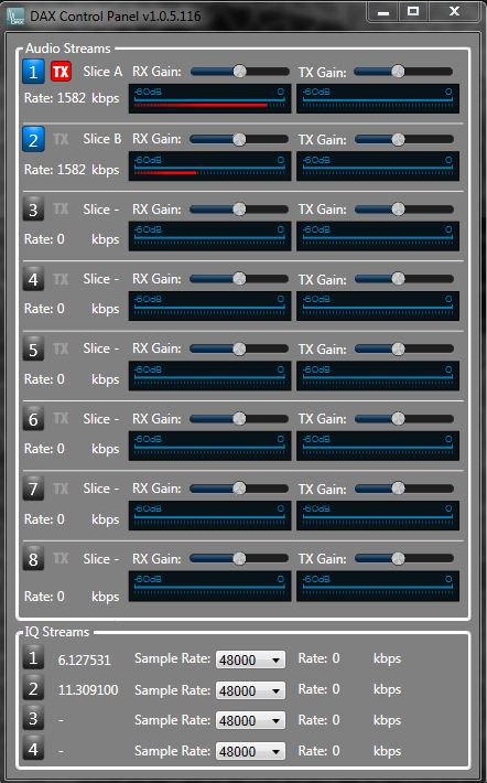 Digital Audio eXchange (DAX) is what is now integrated into SmartSDR to replace the venerable Virtual Audio Cable (VAC) software used with PowerSDR and previous generations of Flex radios.  DAX is a somewhat clumsy alternative and in a lot of cases, I just have problems trying to get it to work properly and do what I want it to do.  The interface is nice, but I just can’t always seem to get the audio where I want it without really digging down into the bowels of the Windows 7 sound settings in the control panel.  For example, I tried output the audio of a second receiver slice to Ham Radio Deluxe Log.  In the logging software there is a digital recorder that I like to use to record and catalog various transmissions.  I struggled with this for quite a bit of time before just giving up on it (I haven’t had the patients to go back to it again yet ;).  For whatever reason I can only seem to get audio on the 1st DAX channel.  I think this has something to do with Windows settings in relation to DAX, but when I used VAC, I didn’t have any issues or problems trying to get the audio from PowerSDR to various other software applications.  So DAX in my book should be looked at to be more intuitive (however I don’t know how possible this is given Microsoft’s settings for Windows 7 audio).  There is also virtual audio ports for IQ stream data so that this information could be output to other software which I thought was really awesome (however I have not experimented with it yet).