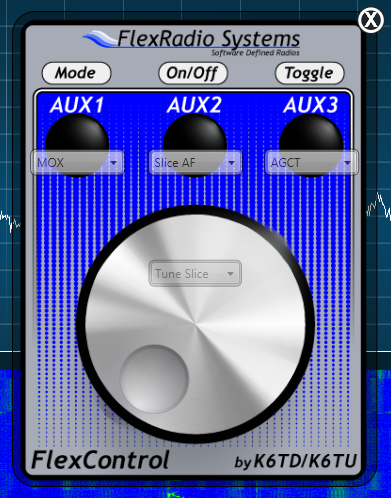 My FlexControl configuration.  Note the MOX button on the upper left to use as a toggle style (push on - push off) switch to transmit.